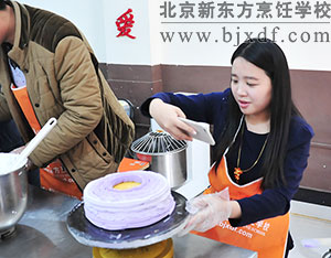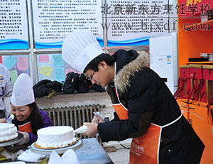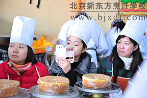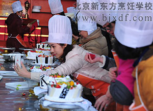 上午,做蛋糕的各种原材料准备就绪后,来自核信息院的女同胞们认真地聆听着我校西点老师对做奶油蛋糕程序的每一步讲解演示。原料的配比,到搅拌,再到打浆,都需要西点师耐心细致的操作。在原料称重的时候,隔壁出版工作的女神们为精准地称重而欢呼,也有团队则为那一克的差距焦虑着。你切水果,我抹果酱;你摆造型,我挑颜色;你挤奶油,我贴巧克力,在北京新东方西点教室里,美女们专心致志的做着自己的蛋糕和点心,每一个人都有一位北京新东方烹饪学校的学生在旁边指导,整个西点区域教室都充满着欢腾的声音。