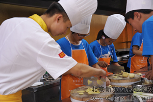 为了能让这些可爱的朋友真正体验到生活和烹饪美食的乐趣,北京新东方烹饪学校特别安排有老师先操作,之后在老师的指导下,让这些初中生以团队协作的形式自己烹饪美食。